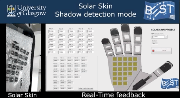 當暴露在光源下時,電子皮膚上的太陽能電池就會產生能量。如果電子皮膚上的一個單元格被接近的物體遮擋,則光的強度以及因此產生的能量會降低,當單元格與物體接觸并確認觸摸時,其強度會降低至零。